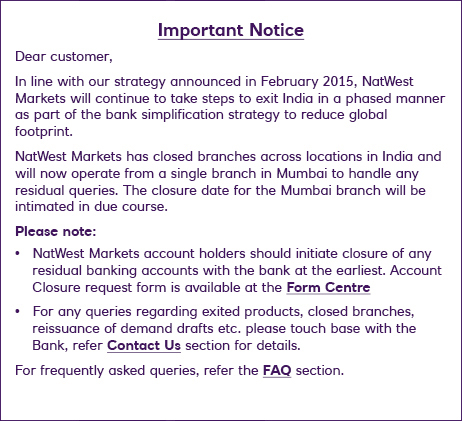 The Schedule of Benefits/ Charges applicable to your account will be revised with effect from 1 October 2017. The account service charges will be revised from Rs 100 per month to Rs 500 per month. For further clarifications, please call our Bank by Phone or visit the NatWest Markets branch at Mumbai.